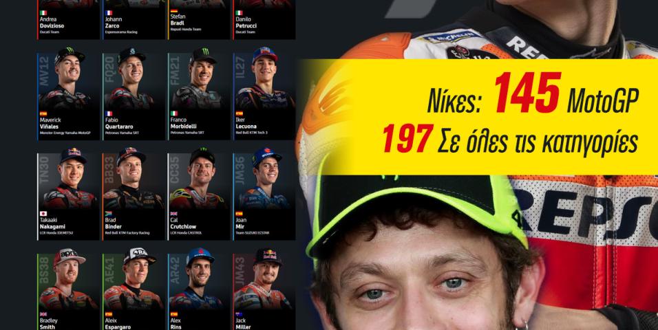 Race News 17/10/2020 MotoGP: Τα στατιστικά του grid όταν λείπουν Rossi και Marquez Τώρα που απουσιάζει και ο Rossi και ο Marquez, τα στατιστικά καριέρας πέφτουν κατακόρυφα για τους υπόλοιπους που απομένουν. Σχεδόν το σύνολο νικών σε όλες τις κατηγορίες που έχουν οι υπόλοιποι, ισοφαρ...